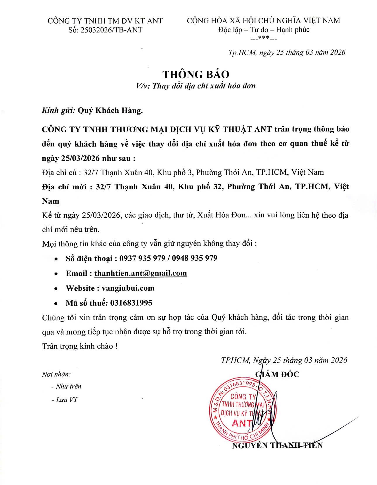 CÔNG TY TNHH THƯƠNG MẠI DỊCH VỤ KỸ THUẬT ANT trân trọng thông báo đến quý khách hàng về việc thay đổi địa chỉ xuất hóa đơn theo cơ quan thuế kể từ ngày 25/03/2026 như sau :